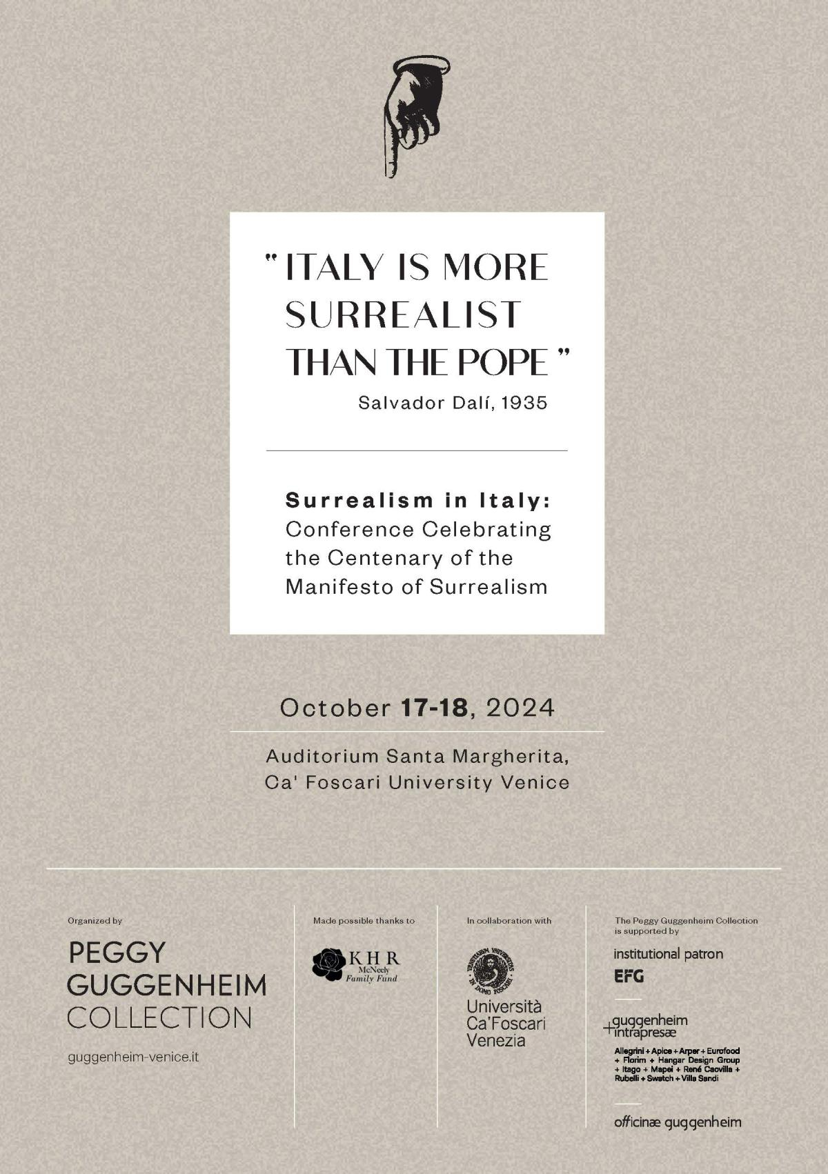 Marking the centenary of the publication of the Manifesto of Surrealism, the conference “Italy is More Surrealist than the Pope” aims to explore the significance of Italy for international Surrealism from the 1920s through to the post-World War II period. It will provide an unparalleled opportunity to reevaluate Surrealism and its relation to Italy through an analytical study of Italy’s cultural framework, and to present innovative arguments aimed at mapping and unearthing the lesser known, but critical themes and perspectives.