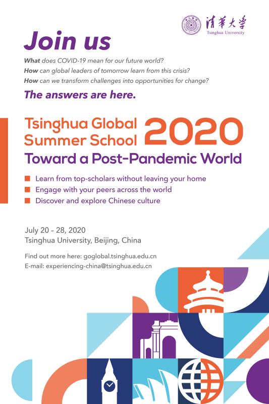 Tsinghua's first virtual summer school, Tsinghua Global Summer School (GSS) 2020, Toward a Post-Pandemic World, is going to be held from July 20 to 28, 2020.