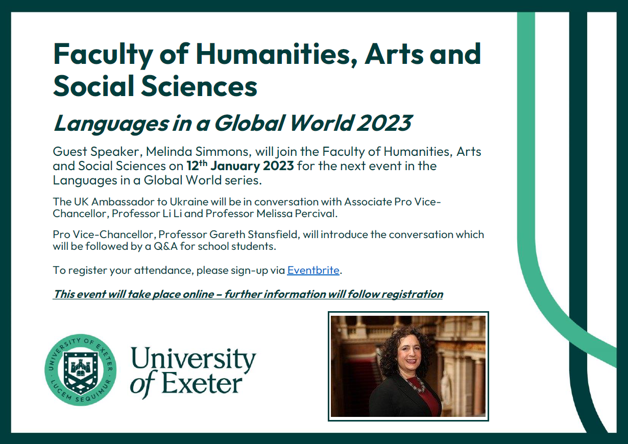 Professor Gareth Stansfield, Pro-Vice-Chancellor for the Faculty of Humanities, Arts and Social Sciences will introduce guest speaker, Exeter graduate and UK Ambassador to Ukraine, Melinda Simmons. Professor Li Li, Associate Pro-Vice-Chancellor for Global Engagement and Professor Melissa Percival, Professor of French, Art History and Visual Culture, will lead a conversation with Melinda to explore the key role her undergraduate degree in French and German has played in her career and her experience of the powerful skillset that comes with knowledge of a variety of languages. The conversation will be followed by a Q&A for school students.