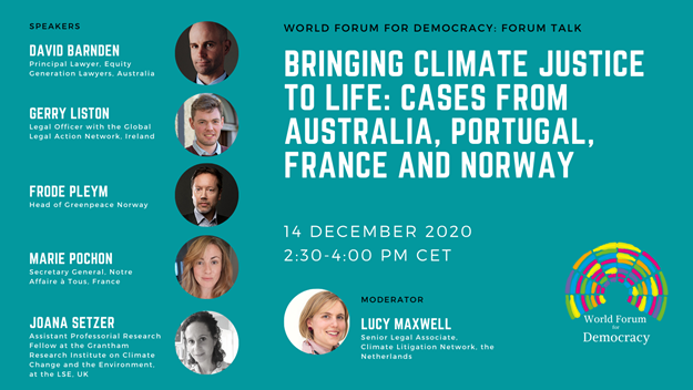 The general discussion on resorting to strategic litigation as a tool to fight climate change will be followed by concrete examples of ongoing law suits worldwide. In particular, it will focus on cases from Australia, Portugal, Norway and France where individuals or organisations brought legal complaints against governments before the courts.
