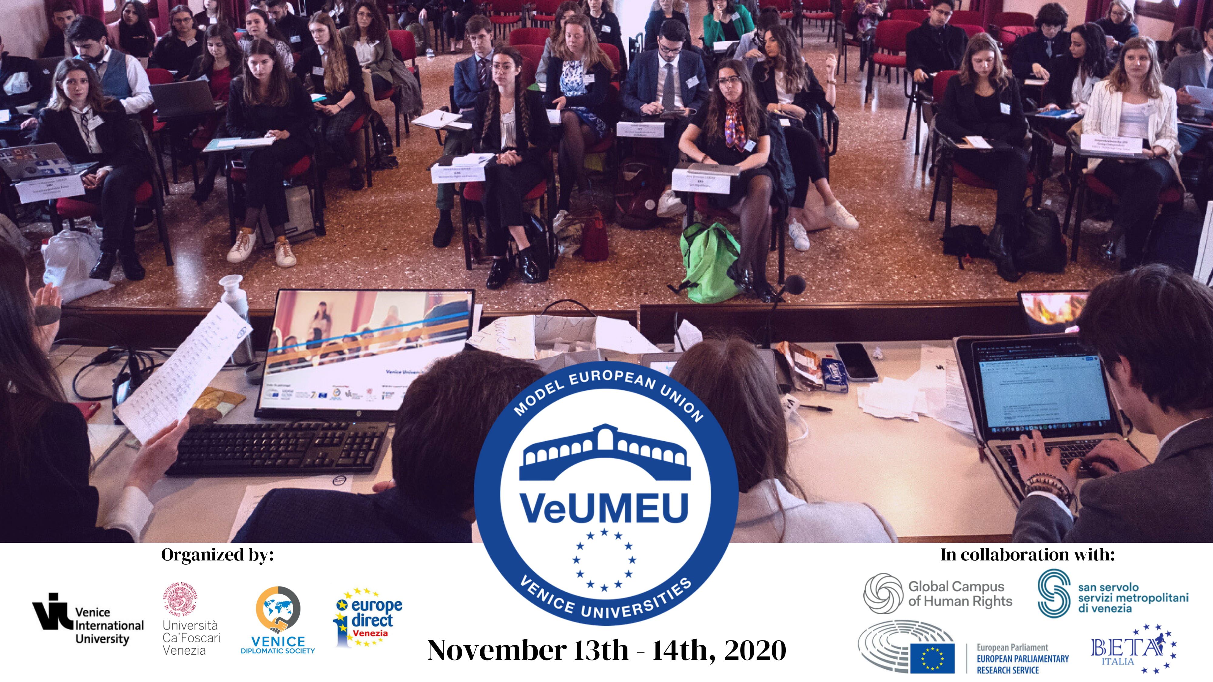 Venice International University (VIU), Ca' Foscari University of Venice and Venice Diplomatic Society, with the support and participation of Europe Direct of the City of Venice and the European Parliament Research Service will organise the fourth edition of the Venice Universities' Model European Union on November 13-14, 2020.