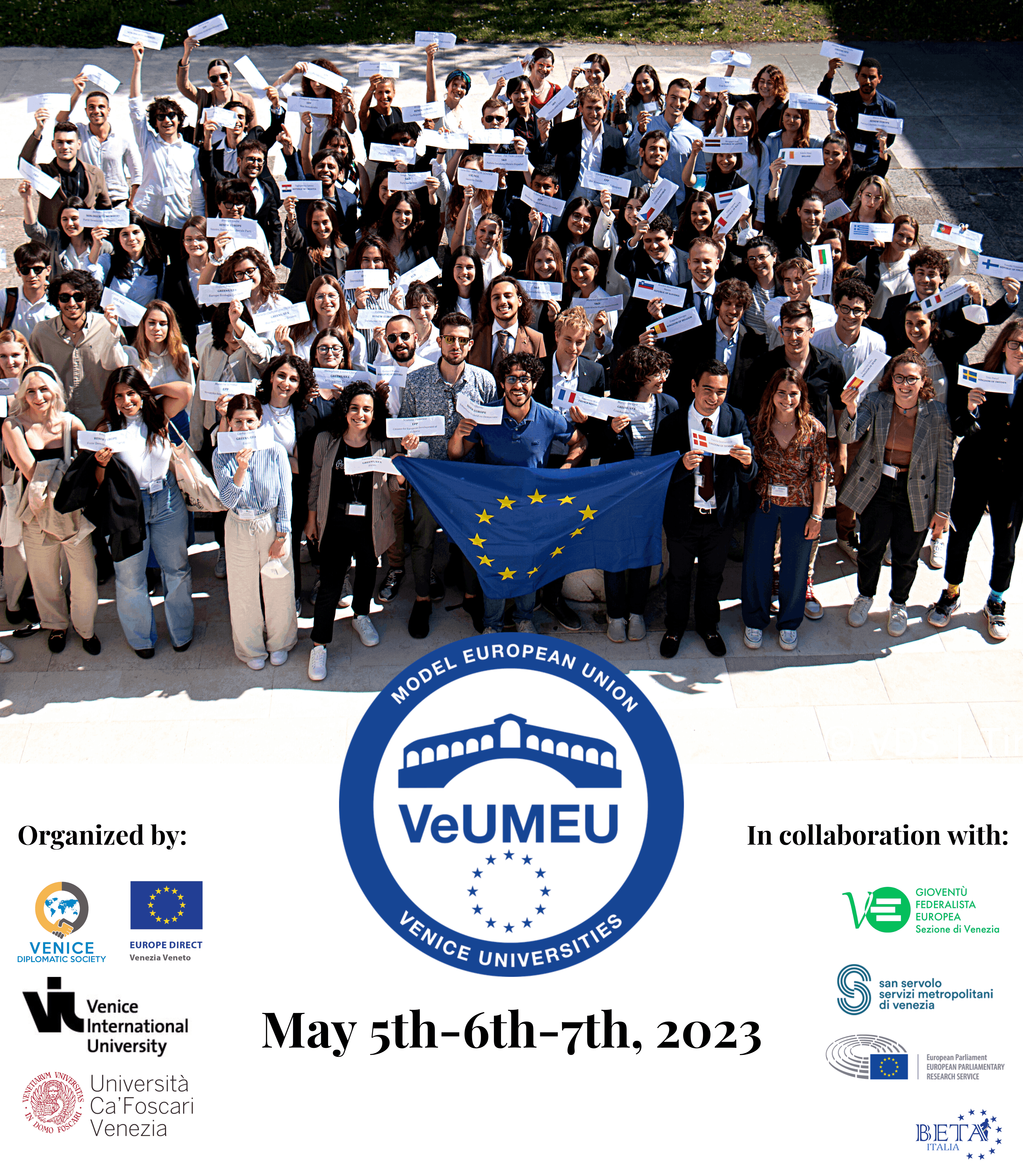 Venice International University (VIU), Ca' Foscari University of Venice and Venice Diplomatic Society, with the support and participation of Europe Direct of the City of Venice and the European Parliament Research Service will organize the seventh edition - in person - of the Venice Universities' Model European Union on May 5-6-7, 2023.
